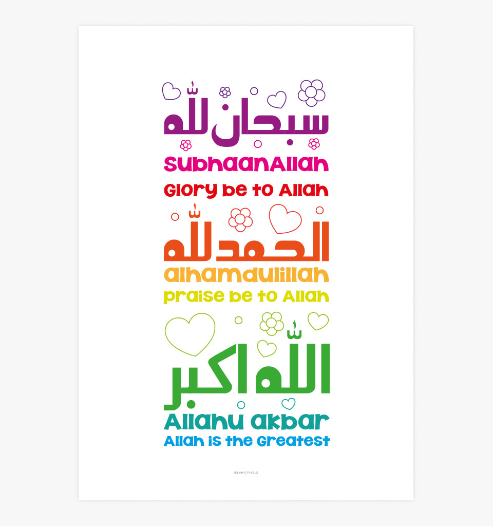 3 glorious phrases, Subhan’allah, Alhamdulillah and Allahu Akbar all showcased in one print, complete in a frame of your choice. The Glorious Phrases would look great in a child's bedroom or playroom.