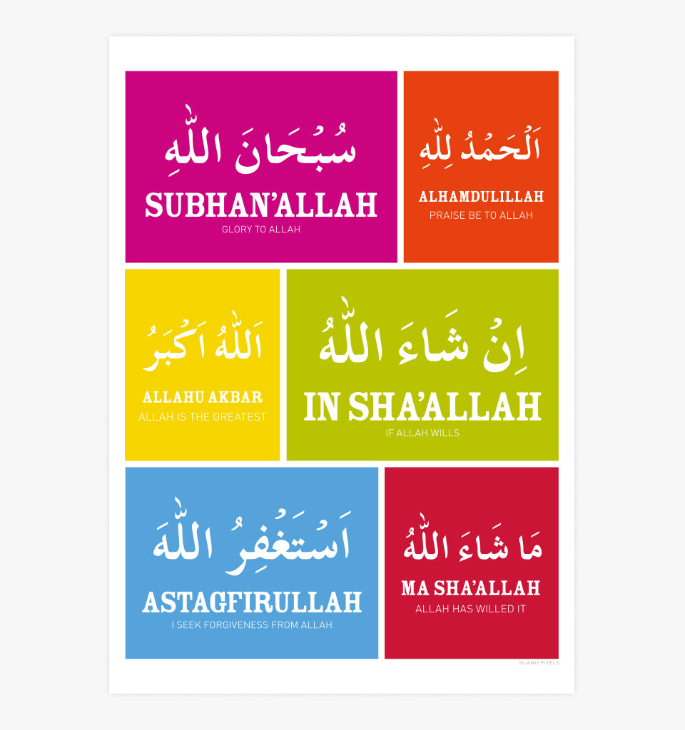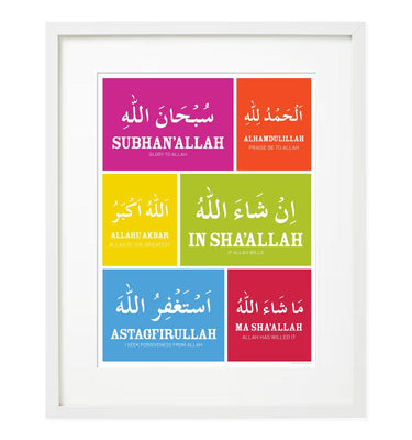 6 glorious phrases, Subhan’allah, Alhamdulillah, Allahu Akbar, In sha’allah, Astagfirullah and Ma sha’allah all showcased in one print, complete in a frame of your choice.