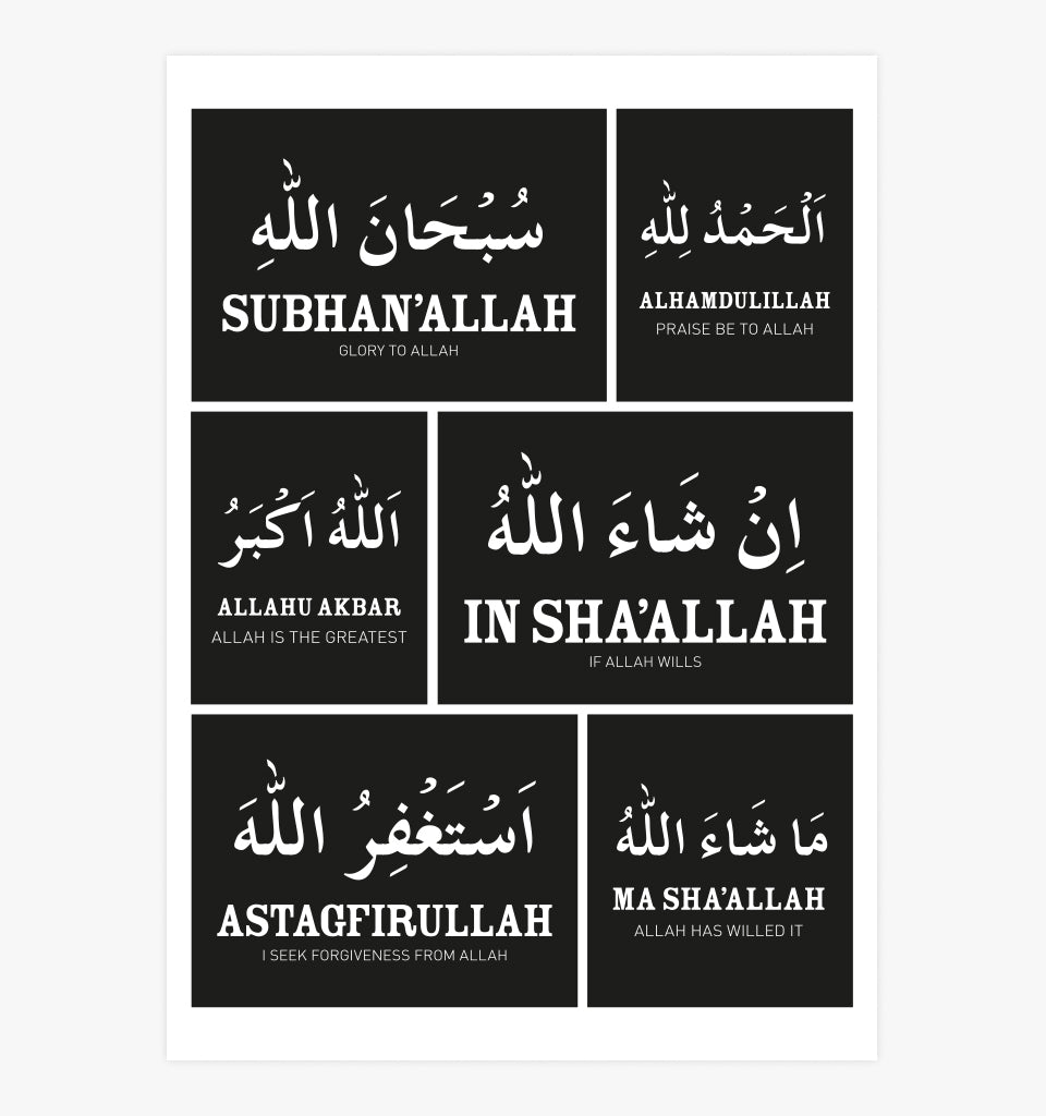 6 glorious phrases, Subhan’allah, Alhamdulillah, Allahu Akbar, In sha’allah, Astagfirullah and Ma sha’allah all showcased in one print, complete in a frame of your choice.  The Glorious Phrases would look equally great in a child's bedroom or playroom or a grown up space and would make an ideal gift for a new home, office or your friends and family.