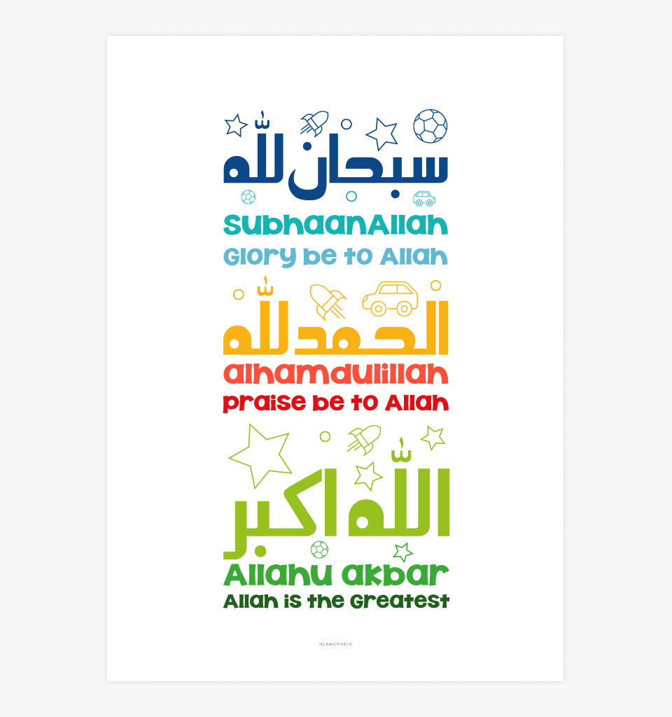 3 glorious phrases, Subhan’allah, Alhamdulillah and Allahu Akbar all showcased in one print, complete in a frame of your choice. The Glorious Phrases would look great in a child's bedroom or playroom.